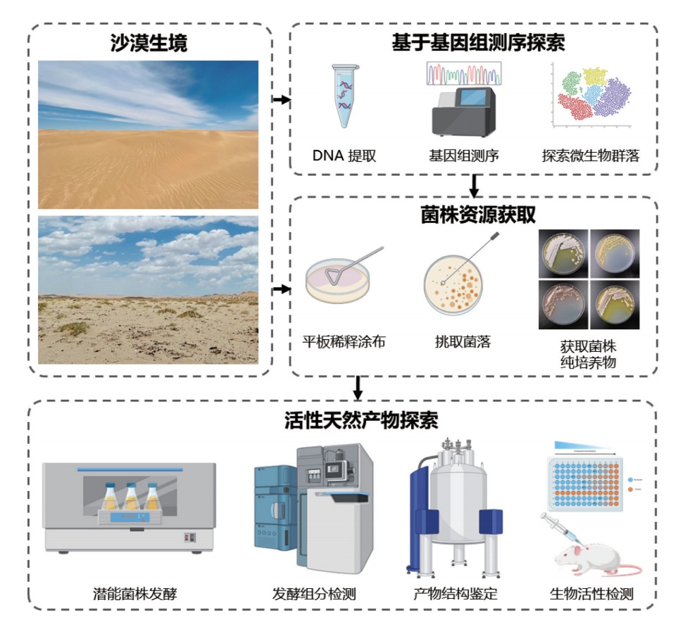 Deserts, as typical extreme ecosystems, harbour unique microbial communities with remarkable environmental adaptability and biotechnological potential. This review systematically summarizes recent advances in understanding desert microbial diversity, functional mechanisms, and resource utilization. By integrating high-throughput sequencing, multi-omics approaches, and innovative cultivation technologies, we elucidate microbial adaptation strategies under extreme stressors and propose an integrated “diversity-function-application” research framework. Studies have revealed that desert microorganisms produce a range of bioactive compounds with antibacterial, antitumour, and anti-radiation activities, demonstrating broad application prospects in pharmaceuticals, agriculture, and industry. Furthermore, these microbial communities play critical roles in carbon and nitrogen cycling, ecological restoration, and responses to global changes. Although traditional cultivation methods have limited access to the vast “microbial dark matter”, interdisciplinary technological integration is gradually overcoming this bottleneck. Future research should prioritize the construction of microbial resource banks, in-depth functional gene mining, and the transformation of green biotechnologies to provide scientific and technological support for addressing global challenges.